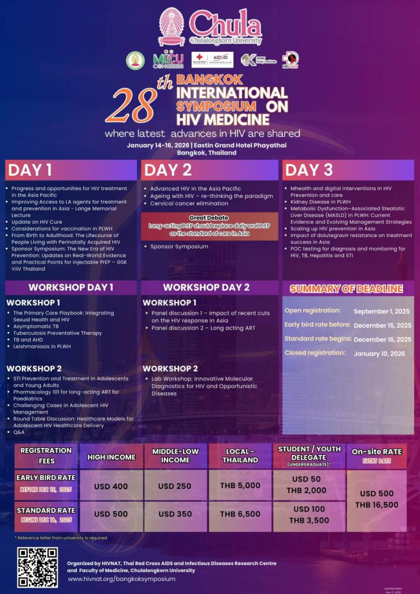สาขาวิชาโรคติดเชื้อ ภาควิชาอายุรศาสตร์ คณะแพทยศาสตร์ จุฬาลงกรณ์มหาวิทยาลัย ร่วมกับ ศูนย์ประสานความร่วมมือระหว่างไทย ออสเตรเลีย เนเธอร์แลนด์ เพื่อการศึกษาวิจัยทางคลินิกด้านโรคเอดส์ ภายใต้ศูนย์วิจัยโรคเอดส์และโรคติดเชื้อ สภากาชาดไทย ขอเชิญเข้าร่วมประชุมวิชาการนานาชาติด้านเอชไอวี ครั้งที่ 28 (28th Bangkok International Symposium on HIV Medicine) ภายใต้หัวข้อเรื่อง Where latest advances HIV are shared ในระหว่างวันที่ 14-16 มกราคม 2569 ณ โรงแรมอีสติน แกรนด์ พญาไท กรุงเทพมหานคร