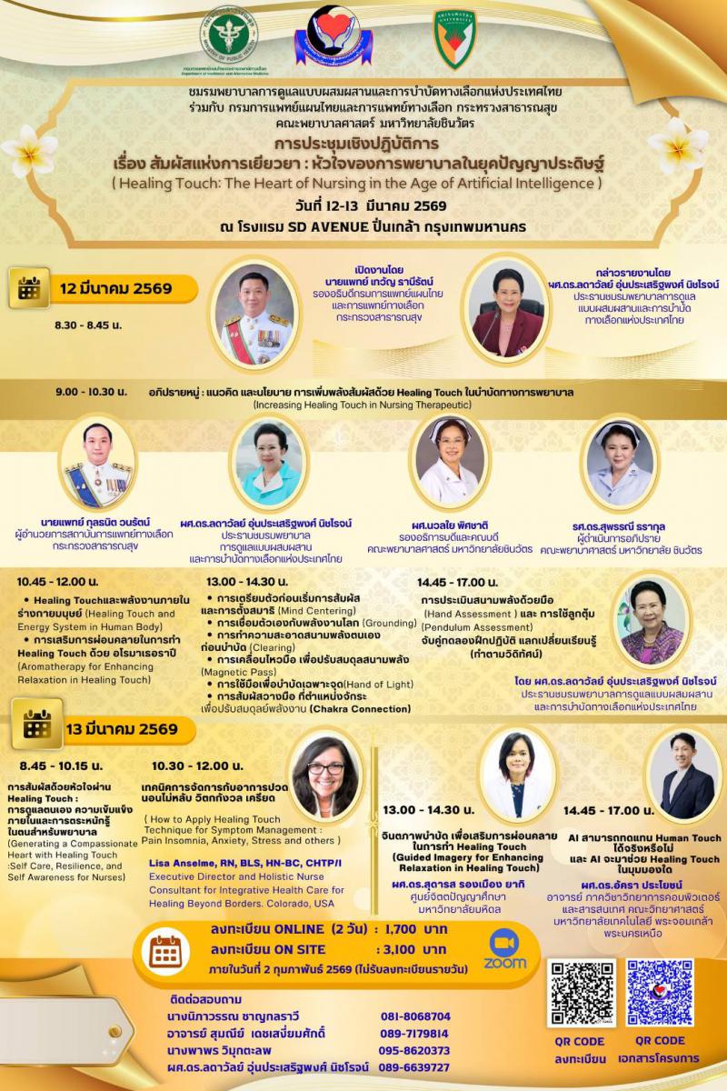 ชมรมพยาบาลการดูแลแบบผสมผสานและการบำบัดทางเลือกแห่งประเทศไทย ร่วมกับกรมการแพย์แผนไทย และการแพทย์ทางเลือก กระทรวงสาธารณสุข และคณะพยาบาลศาสตร์ มหาวิทยาลัยชินวัตร ขอเชิญเข้าร่วมประชุม เชิงปฏิบัติการ เรื่อง สัมผัสแห่งการเยียวยา: หัวใจของการพยาบาลในยุคปัญญาประดิษฐ์ ( Healing Touch : The Heart of Nursing in The Age of Artificial Intelligence ) ระหว่างวันที่ 12-13 มีนาคม 2569 เป็นการจัดประชุมแบบ Online Meeting ผ่าน Zoom Application และ Onsite ที่โรงแรม SD Avenue ปิ่นเกล้า กรุงเทพมหานคร ผู้เข้าร่วมประชุมประกอบด้วย พยาบาล และบุคลากรทีมสุขภาพที่ปฏิบัติงานในสถานบริการสุขภาพสถาบันการศึกษาทั้งภาครัฐและเอกชน รวมถึงผู้ที่สนใจทั่วไป จำนวน 300 คน โดยมีวัตถุประสงค์เพื่อให้ผู้เข้าประชุมมีความรู้และเข้าใจในการใช้สัมผัสแห่งการเยียวยา ด้วยการใช้ Healing Touch ในการบำบัด ทางการพยาบาลและนำความรู้ที่ได้ไปประยุกต์ใช้ในการดูแลผู้ป่วยทุกระยะ