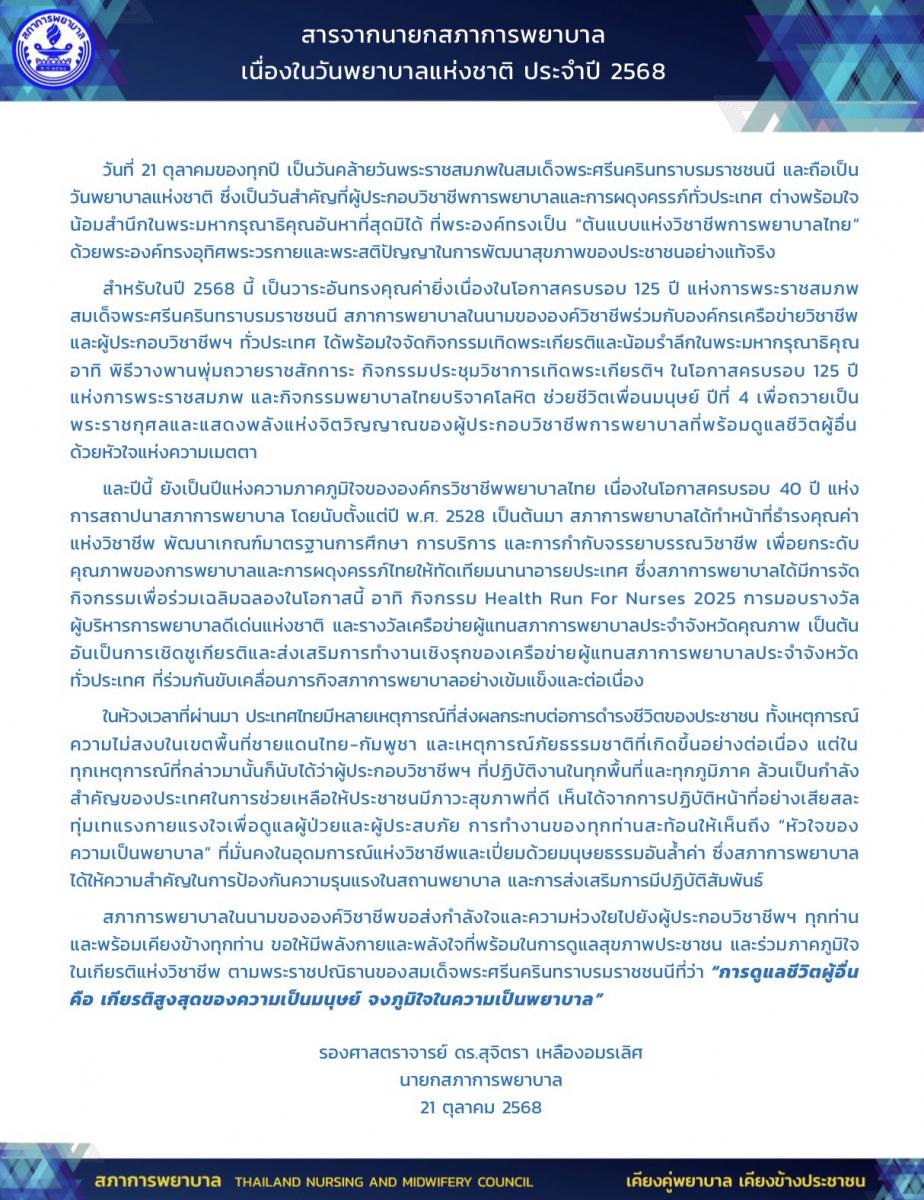 สารจากนายกสภาการพยาบาล เนื่องในวันพยาบาลแห่งชาติ 2568