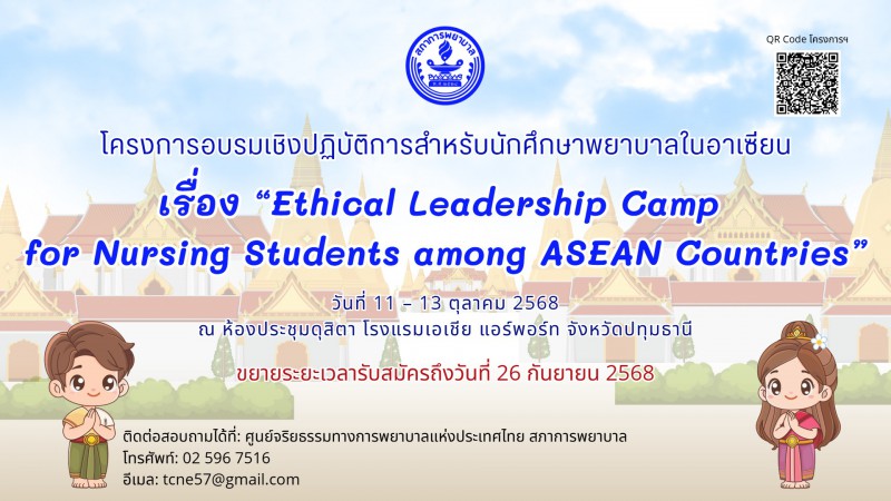 สภาการพยาบาล โดยศูนย์จริยธรรมทางการพยาบาลแห่งประเทศไทย ขอเชิญสถาบันการศึกษาส่งนักศึกษาพยาบาลหลักสูตรพยาบาลศาสตรบัณฑิต ชั้นปีที่ 2 เข้าร่วมอบรมเชิงปฏิบัติการสำหรับนักศึกษาพยาบาลในอาเซียน เรื่อง Ethical Leadership Camp for Nursing Students among ASEAN Countries" ในระหว่างวันที่ 11 - 13 ตุลาคม 2568 ณ ห้องประชุมดุสิตา โรงแรมเอเชีย แอร์พอร์ท จังหวัดปทุมธานี