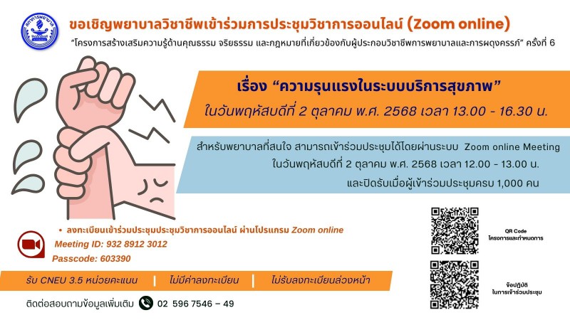 ขอเชิญผู้ประกอบวิชาชีพการพยาบาลและการผดุงครรภ์เข้าร่วมประชุมวิชาการออนไลน์ (Zoom Online) “โครงการสร้างเสริมความรู้ด้านคุณธรรม จริยธรรม และกฎหมายที่เกี่ยวข้องกับผู้ประกอบวิชาชีพการพยาบาลและการผดุงครรภ์” ครั้งที่ 6 เรื่อง “ความรุนแรงในระบบบริการสุขภาพ” ในวันพฤหัสบดีที่ 2 ตุลาคม พ.ศ. 2568 เวลา 12.00 - 16.30 น ณ ห้องประชุมและเครือข่ายออนไลน์ สภาการพยาบาล