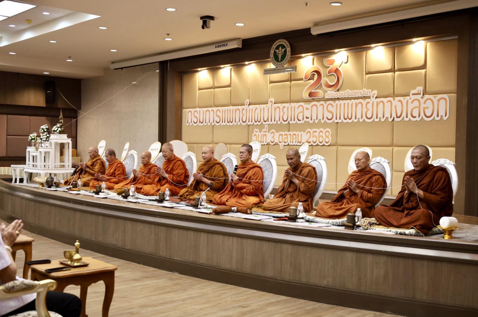 เมื่อวันที่ 3 ตุลาคม 2568 รองศาสตราจารย์ ดร.สุจิตรา เหลืองอมรเลิศ นายกสภาการพยาบาล พร้อมด้วย ดร.สุดคนึง ฤทธิ์ฤาชัย ผู้อำนวยการศูนย์การศึกษาต่อเนื่องสาขาพยาบาลศาสตร์ หัวหน้าสำนักงานเลขาธิการสภาการพยาบาล หัวหน้าฝ่ายนิติการฯ และเจ้าหน้าที่สภาการพยาบาล ร่วมพิธีทำบุญเลี้ยงพระ เนื่องในโอกาสวันคล้ายวันสถาปนากรมการแพทย์แผนไทยและการแพทย์ทางเลือก ครบรอบ 23 ปี พร้อมมอบกระเช้าผลไม้ร่วมแสดงยินดีกับนายสมศักดิ์ กรีชัย รองอธิบดีกรมการแพทย์แผนไทยและการแพทย์ทางเลือก ณ ห้องประชุมบัวหลวงอาคาร 2 ชั้น 1 กรมการแพทย์แผนไทยและการแพทย์ทางเลือก
