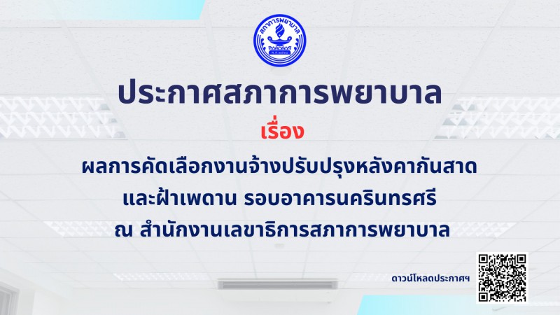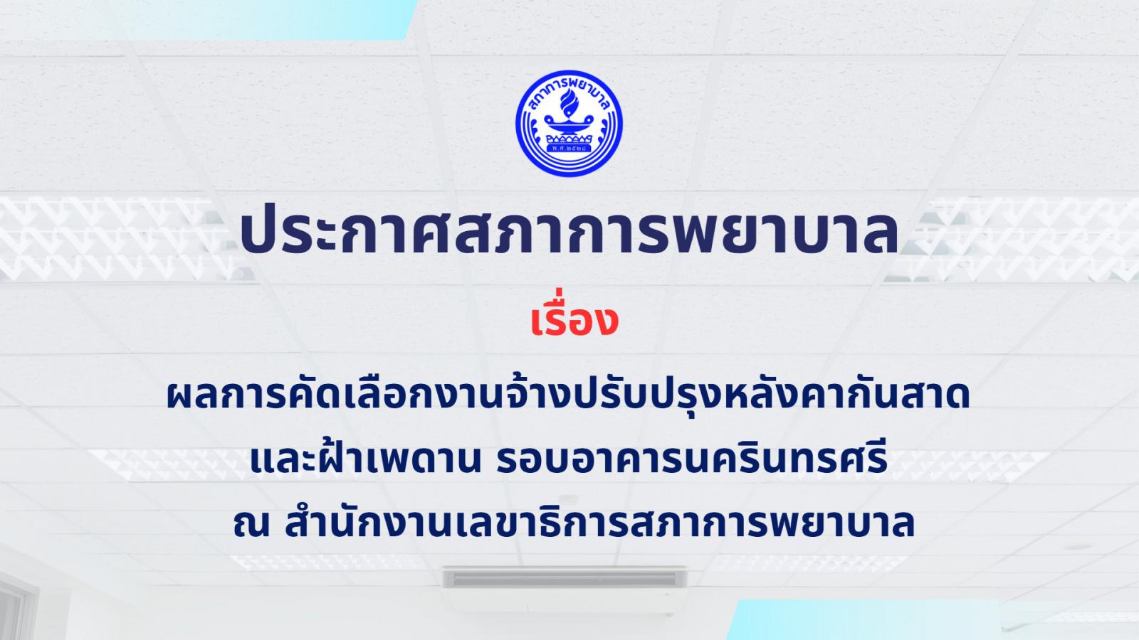 ประกาศสภาการพยาบาล เรื่อง ผลการคัดเลือกงานจ้างปรับปรุงหลังคากันสาด และฝ้าเพดาน รอบอาคารนครินทรศรี ณ สำนักงานเลขาธิการสภาการพยาบาล
