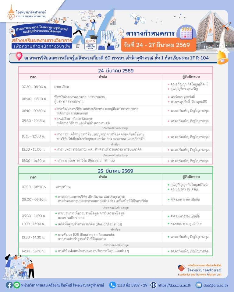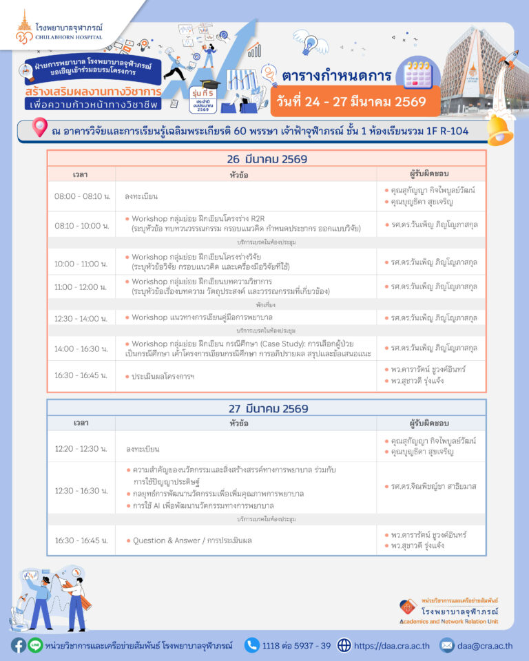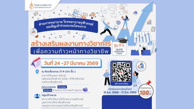 ฝ่ายการพยาบาล โรงพยาบาลจุฬาภรณ์ ขอเชิญพยาบาลวิชาชีพในโรงพยาบาลจุฬาภรณ์ บุคลากรราชวิทยาลัยจุฬาภรณ์ และบุคลากรภายนอกราชวิทยาลัยจุฬาภรณ์ เข้าร่วมอบรมโครงการสร้างเสริมผลงานทางวิชาการเพื่อความก้าวหน้าทางวิชาชีพ รุ่นที่ 5 ประจำปีงบประมาณ 2569 ในวันที่ 24-27 มีนาคม 2569 รูปแบบ Onsite ณ ห้องเรียนรวม 1F R-104 ชั้น 1 อาคารวิจัยและการเรียนรู้เฉลิมพระเกียรติ 60 พรรษา เจ้าฟ้าจุฬาภรณ์ ราชวิทยาลัยจุฬาภรณ์ รูปแบบ Online ผ่านระบบสื่อสารทางไกล Microsoft Teams