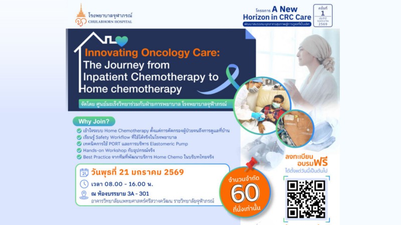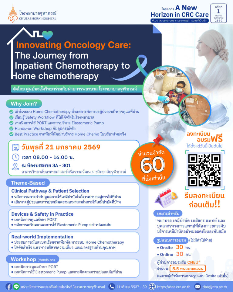 ศูนย์มะเร็งวิทยา ร่วมกับ ฝ่ายการพยาบาล โรงพยาบาลจุฬาภรณ์ ขอเชิญพยาบาล เคมีบำบัด เภสัชกร แพทย์และบุคลากรทางการแพทย์ที่สนใจ เข้าร่วมการอบรม หลักสูตร “A New Horizon in CRC Care: พัฒนาสมรรถนะบุคลากรสุขภาพสู่การดูแลที่เป็นเลิศ” ประจำปีงบประมาณ 2569 ครั้งที่ 1 Innovating Oncology Care: The Journey from Inpatient Chemotherapy to Home chemotherapy ในวันที่ 21 มกราคม 2569 เวลา 08.00 – 16.00 น. รูปแบบ Onsite ณ ห้องบรรยาย 3A-301 ชั้น 3 อาคารวิทยาลัยแพทยศาสตร์ศรีสวางควัฒน ราชวิทยาลัยจุฬาภรณ์ รูปแบบ Online ผ่านระบบสื่อสารทางไกล Microsoft Teamsเจ้าฟ้าจุฬาภรณ์ ราชวิทยาลัยจุฬาภรณ์ รูปแบบ Online ผ่านระบบสื่อสารทางไกล Microsoft Teams