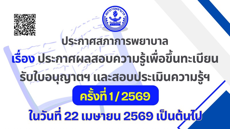 ประกาศสภาการพยาบาล เรื่อง ประกาศผลการสอบความรู้เพื่อขึ้นทะเบียนรับใบอนุญาตฯ และสอบประเมินความรู้ฯ ครั้งที่ 1/2569 วันที่ 22 เมษายน 2569 เป็นต้นไป