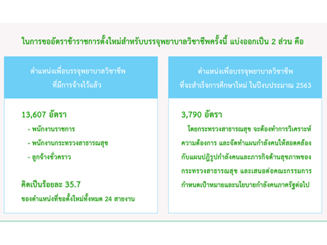 ซึ่งโดยรวมตำแหน่งข้าราชการตั้งใหม่ระหว่างปี 2554-2562 เพื่อบรรจุพยาบาลวิชาชีพเพิ่มขึ้นรวมทั้งสิ้น 24,291 อัตรา หรือเพิ่มขึ้นเฉลี่ยปีละ 3,036 อัตรา แต่ก็ยังไม่เพียงพอต่อการใช้บริการสุขภาพและความเจ็บป่วยที่ซับซ้อนของประชาชน ที่เพิ่มมากขึ้นอย่างก้าวกระโดด