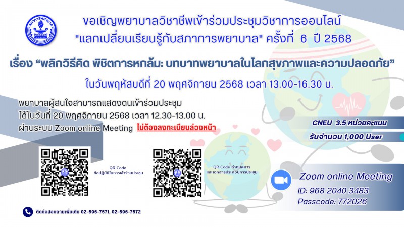 ขอเชิญพยาบาลวิชาชีพเข้าร่วมประชุมวิชาการออนไลน์ (Zoom online) เรื่อง “พลิกวิธีคิด พิชิตการหกล้ม: บทบาทพยาบาลในโลกสุขภาพและความปลอดภัย” ในวันพฤหัสบดีที่ 20 พฤศจิกายน 2568 เวลา 13.00-16.30 น. ณ ห้องประชุมและเครือข่ายออนไลน์ สภาการพยาบาล